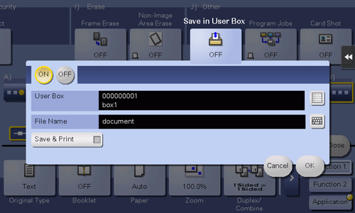 [ON]/[OFF] | Select [ON] to save in a user box. |