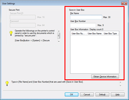 The box number can be checked in the [User Box Information] list. Clicking [Obtain Device Information] obtains the latest information of the box registered in this machine and displays it in the [User Box Information] list.