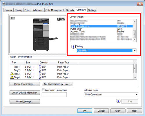In [Device Option] in the [Configure] tab, check that the User Authentication/Account Track setting is correctly configured for your operating environment.