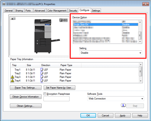In [Device Option] in the [Configure] tab, check that the [User Authentication] and [Single Sign-On] settings are correctly configured for your operating environment.