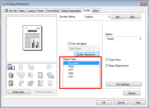 In [Paper Type] in the [Basic] tab, select the type of paper for printing. This function is enabled when [Paper Tray] is set to [Auto].