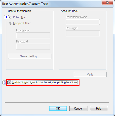 Check [Enable Single Sign-On functionality for printing functions] box, and click [OK].