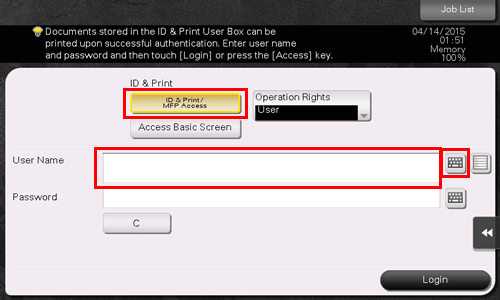 Check that [ID & Print/MFP Access] is selected in [ID & Print], and tap [Login].