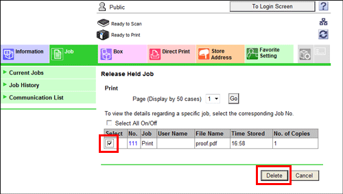 Select the check box of the job to be deleted, and click [Delete].