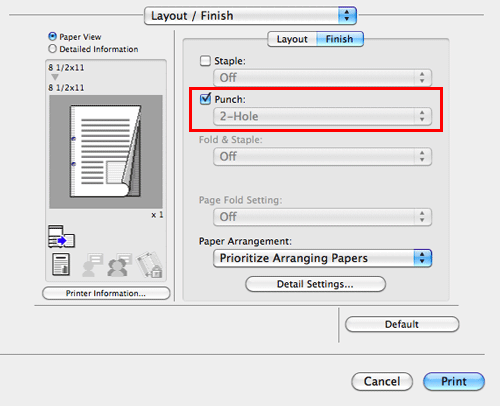 In [Layout / Finish], select the [Punch:] check box. In addition, specify the number and positions of punch holes.