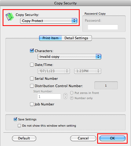 In [Stamp / Composition], select the [Copy Security] check box, then click [Settings...].