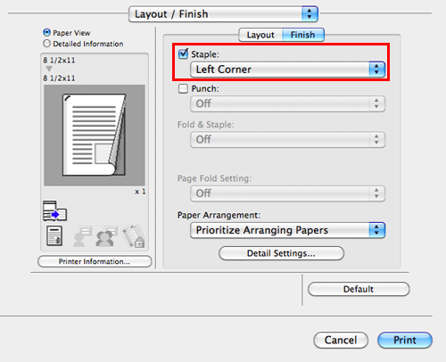 In [Binding Position:] in [Layout / Finish], specify the staple position.