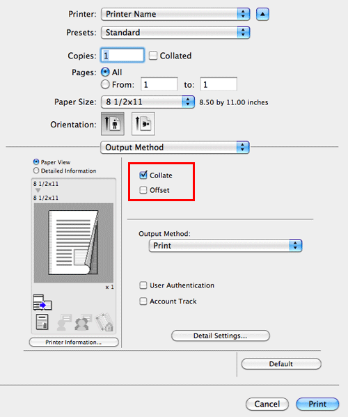 When the [Collate] check box in [Output Method] is selected, copies are output in a set-by-set manner, for example, "Pages 1, 2, 3, 4, and 5", "Pages 1, 2, 3, 4, and 5", and then "Pages 1, 2, 3, 4, and 5". When the [Offset] check box is selected, the sets are output in staggered layers.