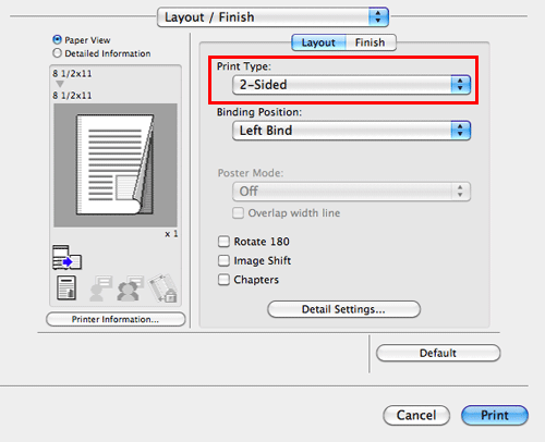In [Print Type:] in [Layout / Finish], select [2-Sided]. [2-Sided] is specified by default.