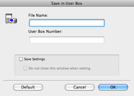 When the [Save Settings] check box is selected, the settings are saved. When the [Do not show this window when setting] check box is selected, this dialog box is not displayed next time. If you always use the same file name and box number, selecting this check box eliminates the need for entering them each time.