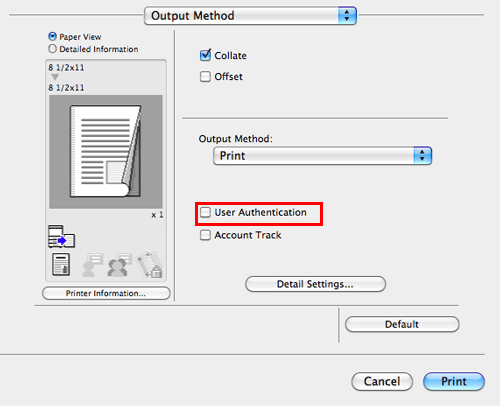In the [Output Method] window, select the [User Authentication] check box (and the [Account Track] check box).