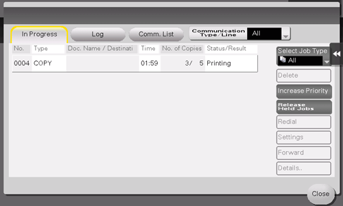 Tap [In Progress] to display current or standby jobs on this machine. As necessary, you can reorder print jobs or delete a standby job.