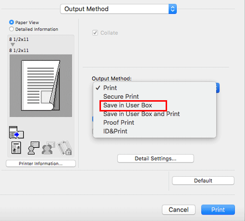 In [Output Method:] in the [Output Method] window, select [Save in User Box].