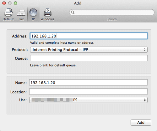 In [Address:], enter the IP address for the machine. In [Queue:], enter "ipp".