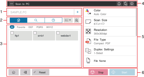 If you tap [Scan to PC] on the home screen, the main screen for PC sending (SMB/FTP/WebDAV) is displayed.