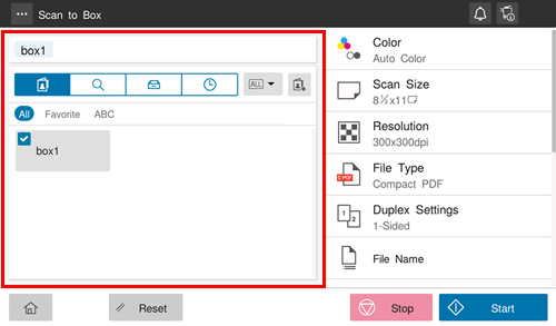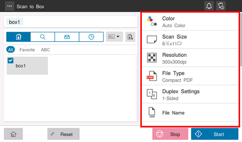 Using the Stop key enables you to stop scanning the original. A list of the currently stopped jobs is displayed. To stop transmission, select the target job from the list, and delete it.