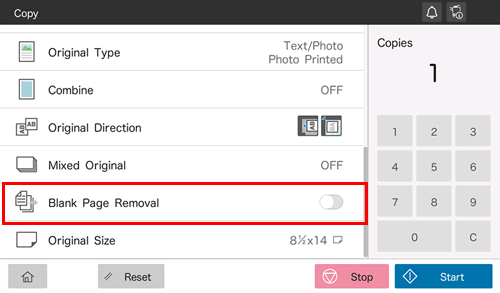 When [Blank Page Removal] is specified to scan an original including blank pages using the ADF, blank pages are excluded from scan targets. Blank pages detected are not counted as original pages.
