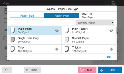 The available paper type varies depending on the paper tray, so the displayed screen is different. For details on the available paper, refer to Here.