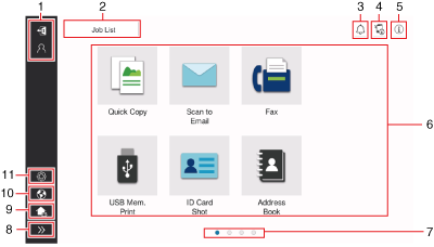 2 | [Job List] | Displays active or standby jobs. If necessary, you can check job logs or print a communication report. This list displays the operation status of the current job on the [Job List] key when it is running. If necessary, you can stop the active job using the Stop key displayed next to the [Job List] key. For details on [Job List], refer to Here. |
