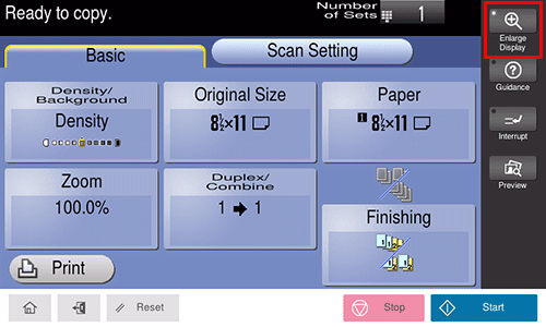 This function configures a screen layout focused on commonly used functions, enabling a user who has difficulty viewing the normal screen to easily perform operations. To return to the normal screen, tap [Enlarge Display] again.