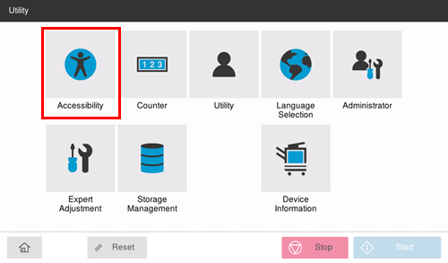 In [Accessibility] of [Utility], you can specify accessibility options of the operating environment such as the adjustment of the Touch Panel or a change of the keying sounds.