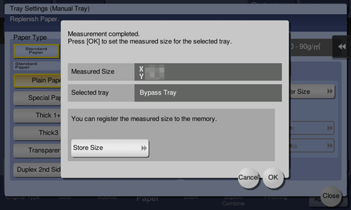 [Registered Paper Size] | Displays the sizes registered in memory. When you call a registered size from the memory, tap the key of the desired registration name, then tap [Recall]. To change a registration name, select a desired key, then tap [Change registered size name]. | |
