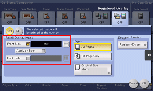 A. Yes. You can register the logos and favorite images in the storage of this machine to add such overlay images to copy outputs.