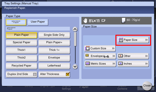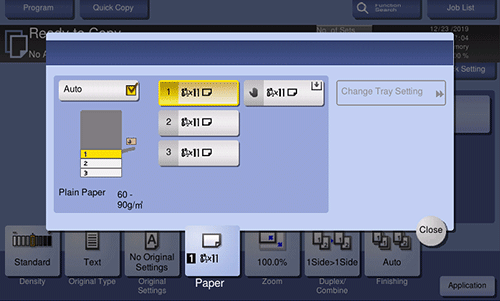 Tap [Paper], select a paper tray to load paper into in order to copy a card, then tap [Close].