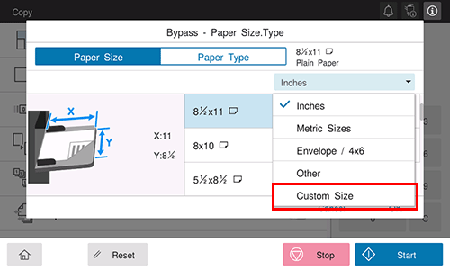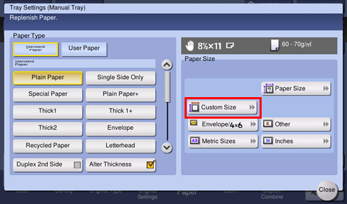 On the paper screen of copy mode, specify the tray containing custom size paper; this will enable you to print on custom size paper.