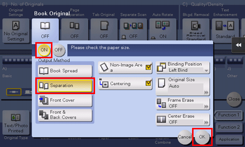 Tap [ON], select [Book Spread], then tap [Center Erase].