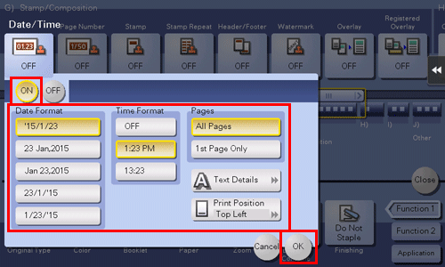 Tap [ON], set values for [Date Format], [Time Format] and [Pages], then tap [OK].