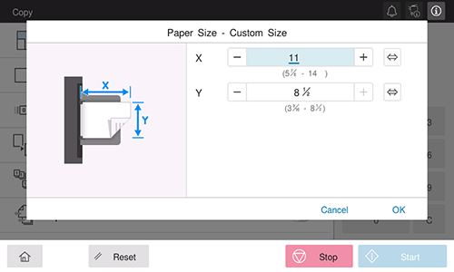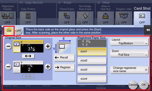 [Original Size] | Enter the size of a card to be copied. Alternatively, you can recall the preregistered size from [Registered Paper Size]. After you have entered the size, select a key in [Registered Paper Size], and tap [Register]. Then the size you have entered is registered in the memory. | |