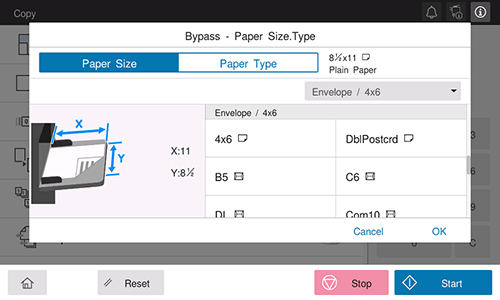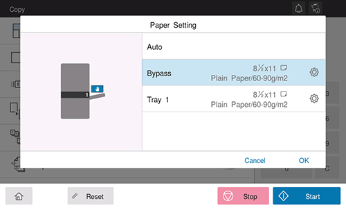 Tap [Paper] and select Bypass Tray. Then, tap [Change Tray Setting].