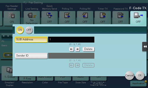 Tap [Application] - [Fax Setting] - [F-Code TX], and tap [ON].