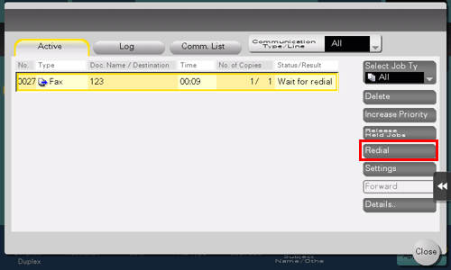 Pending jobs for resending are resent automatically after a certain period of time has elapsed using the auto redial function. However, you can manually resend the fax.