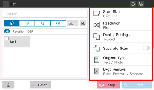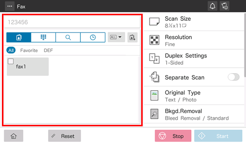 Using the Stop key enables you to stop scanning the original. A list of the currently stopped jobs is displayed. To stop transmission, select the target job from the list, and delete it.