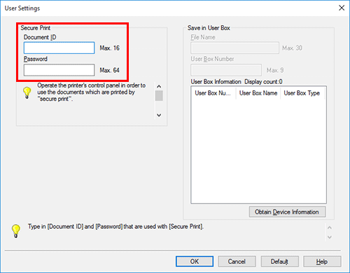Data printed using the Secure Print function is saved in the Secure Print User Box. To print the saved data, you need to enter the document ID and password specified in the printer driver.