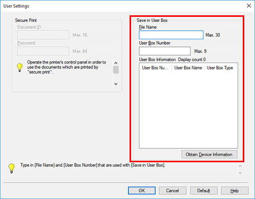 The box number can be checked in the [User Box Information] list. Clicking [Obtain Device Information] obtains the latest information of the box registered in this machine and displays it in the [User Box Information] list.