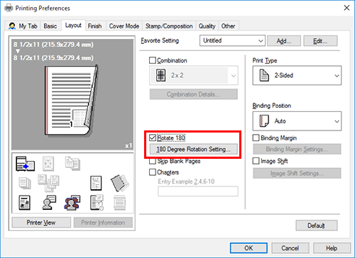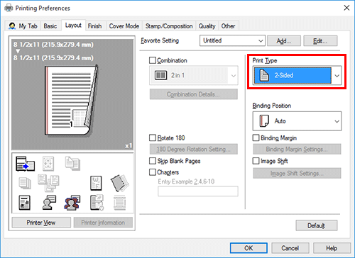 In [Print Type] in the [Layout] tab, select [2-Sided]. [2-Sided] is specified by default.