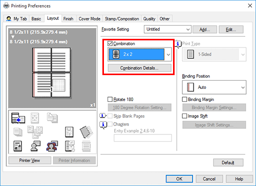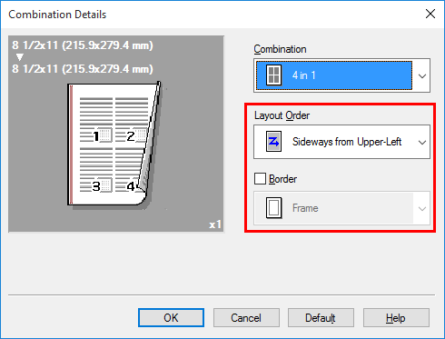 If necessary, click [Combination Details...] to set the page layout order and whether to input border lines between pages.