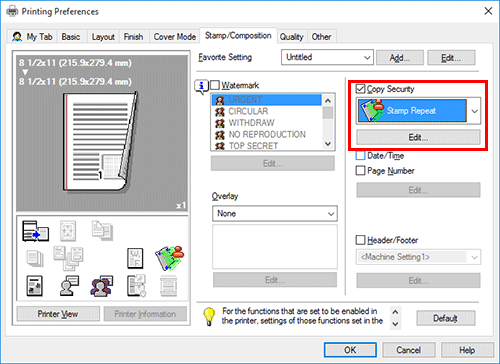 In the [Stamp/Composition] tab, select the [Copy Security] check box, and then select [Stamp Repeat].