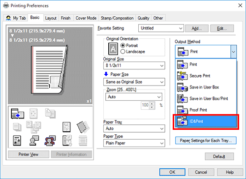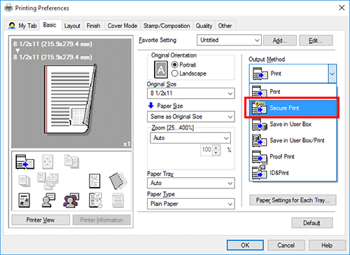 In [Output Method] in the [Basic] tab, select [Secure Print].