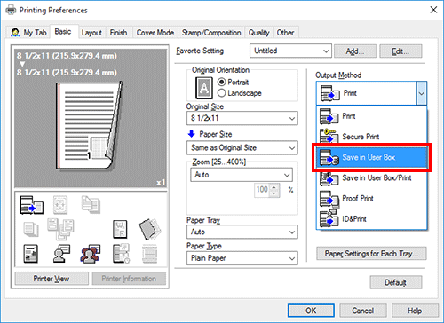 In [Output Method] in the [Basic] tab, select [Save in User Box].