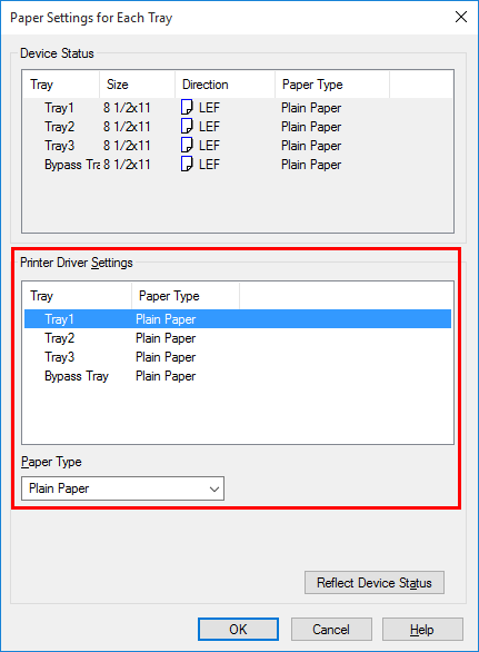 When [Paper Settings for Each Tray] is enabled in the [Settings] tab of the printer driver, select [Paper Settings for Each Tray...] in the [Basic] tab, and specify the paper type for each tray.