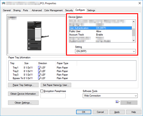 In [Device Option] in the [Configure] tab, check that the User Authentication/Account Track setting is correctly configured for your operating environment.
