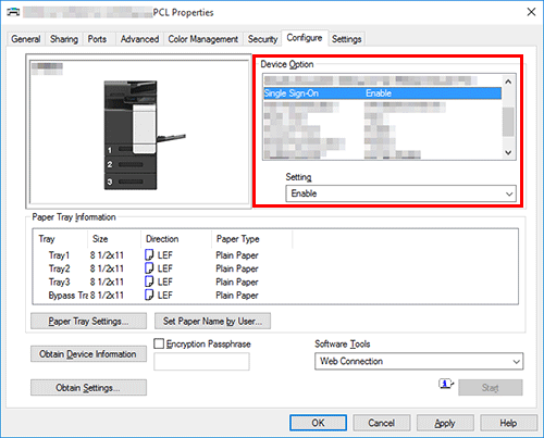 In [Device Option] in the [Configure] tab, check that the [User Authentication] and [Single Sign-On] settings are correctly configured for your operating environment.