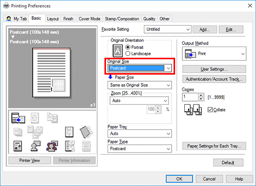 In [Original Size] on the [Basic] tab, select [Envelope] or [Postcard].