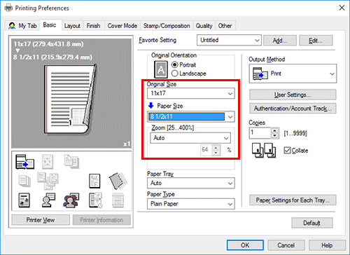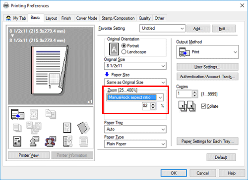 In [Paper Size] in the [Basic] tab, select the size of paper for printing. The zoom ratio is automatically determined by the paper sizes selected in [Original Size] and [Paper Size].