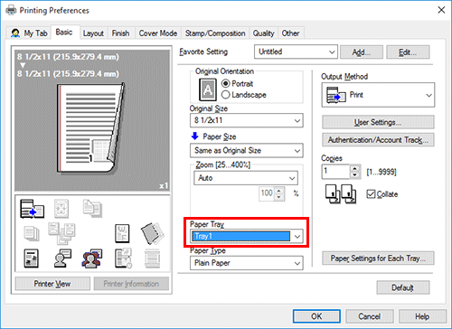 In [Paper Tray] in the [Basic] tab, select the paper tray for printing.