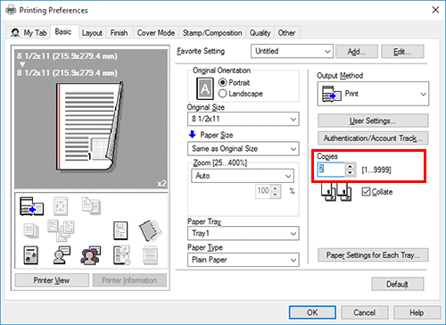 In [Copies] in the [Basic] tab, specify the number of copies you want to print.